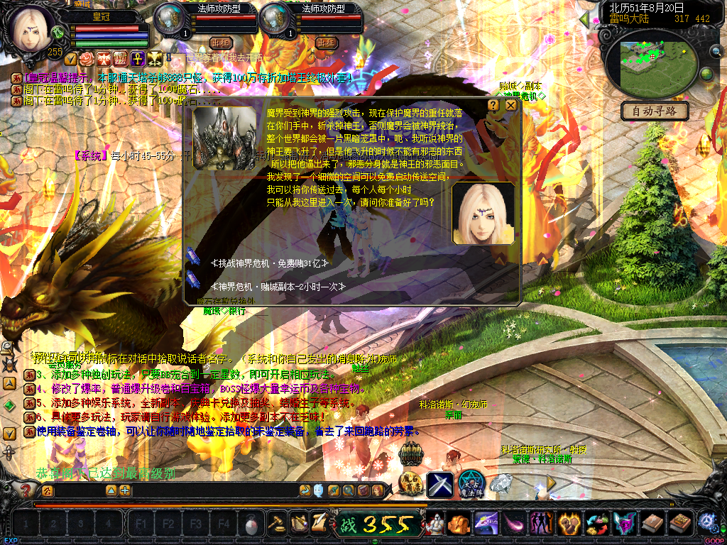 01、上线送VIP10人物255级和赠1000万MS,仓库对面会员NPC处领取全属性+255555装备一套.还可以一键学习本职业所有技能!雷鸣门口NPC领取!bs入包500万,蜘蛛王入包1000万