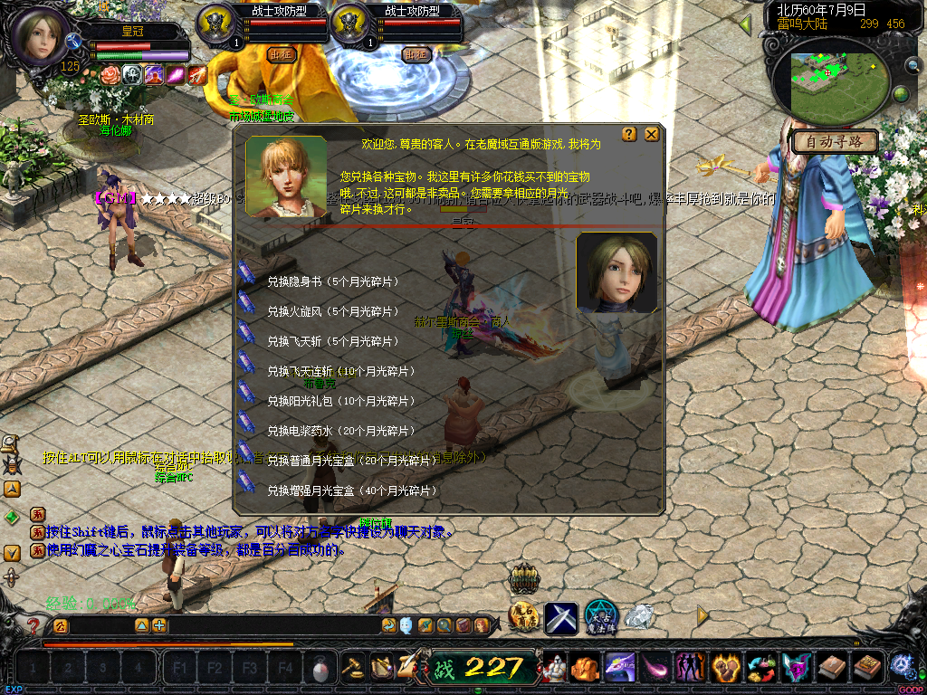 1、本服独家设置战士法师宝宝都可以合体 仓库对面NPC月光碎片换各种职业技能书。