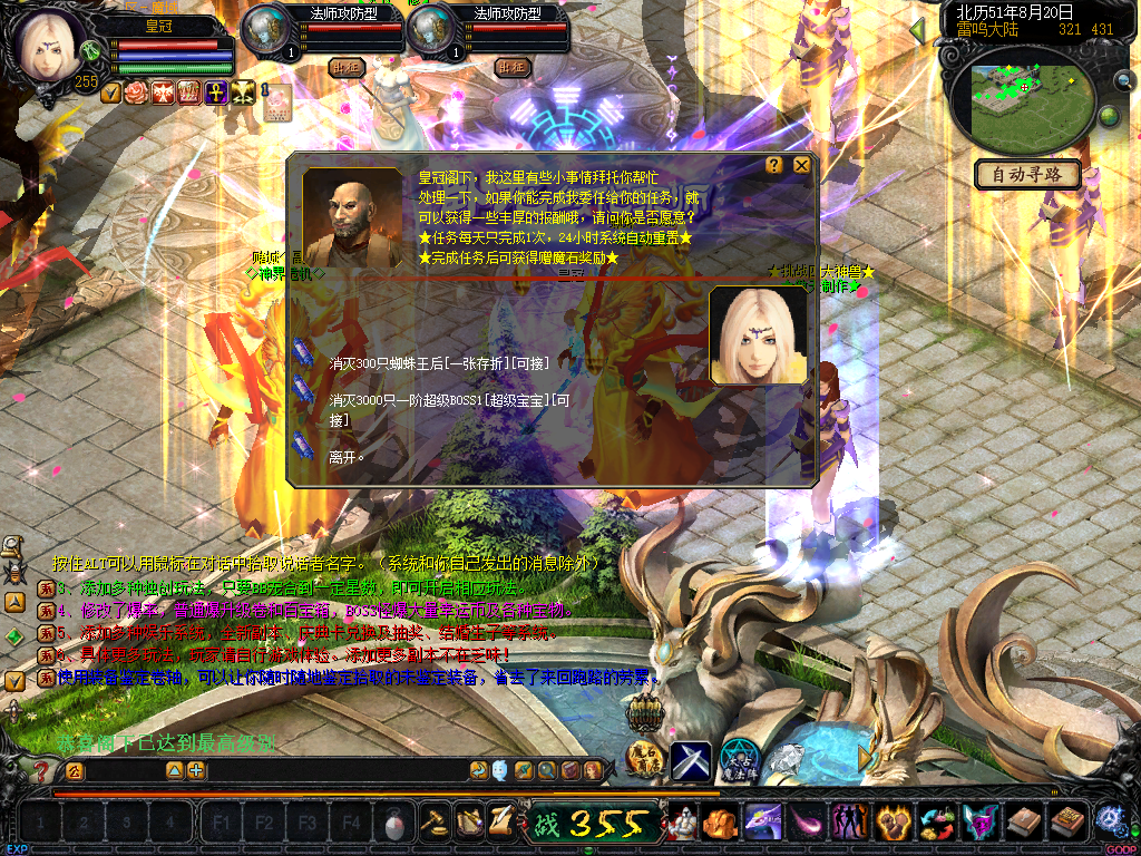 17、新加入蜘蛛BS奖励:所有人每天可接受任务打死300只BOOS和300只蜘蛛可去NPC领取1张存折卡!雷鸣口接任务领取!
