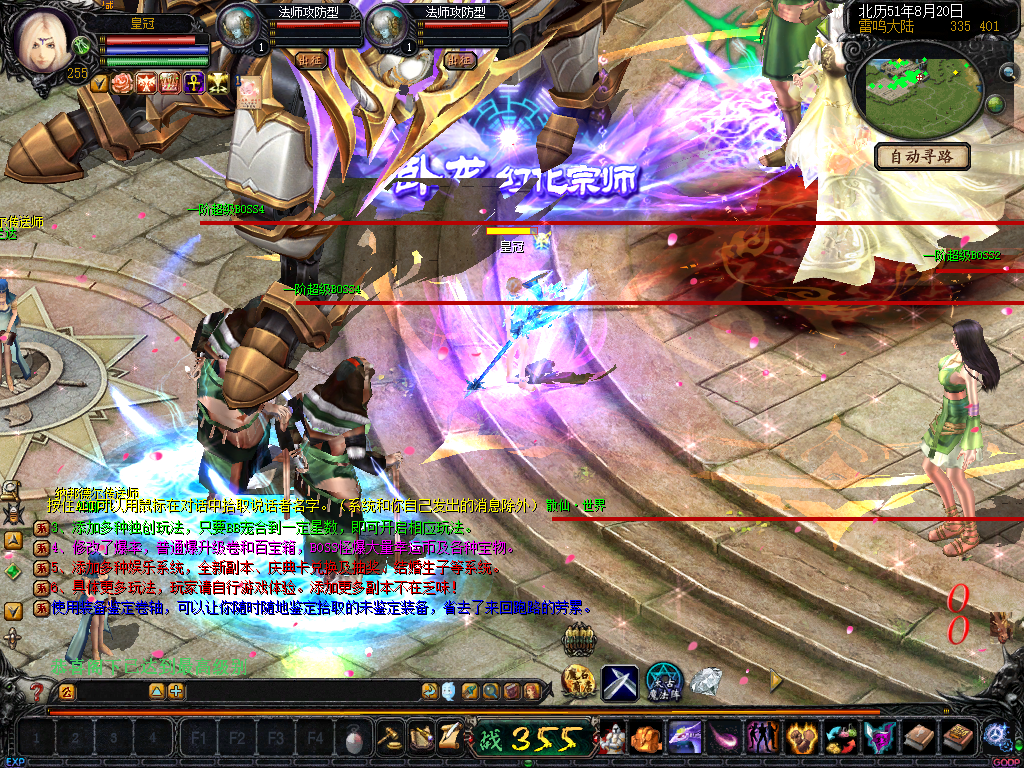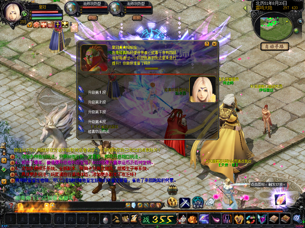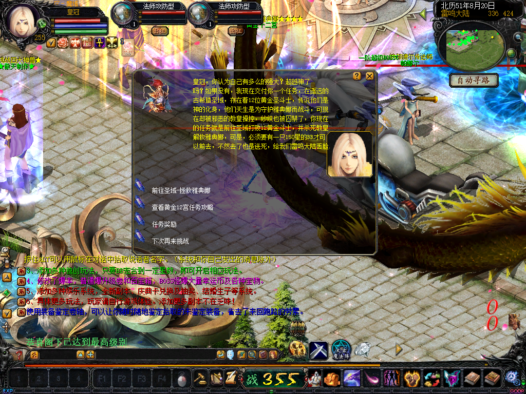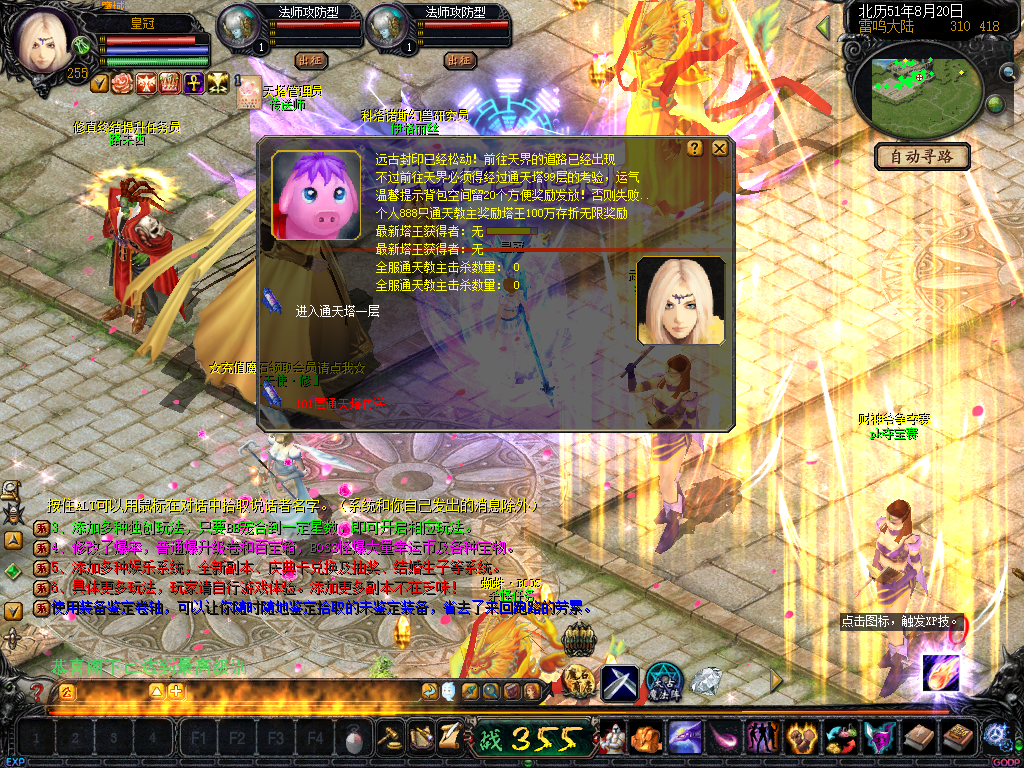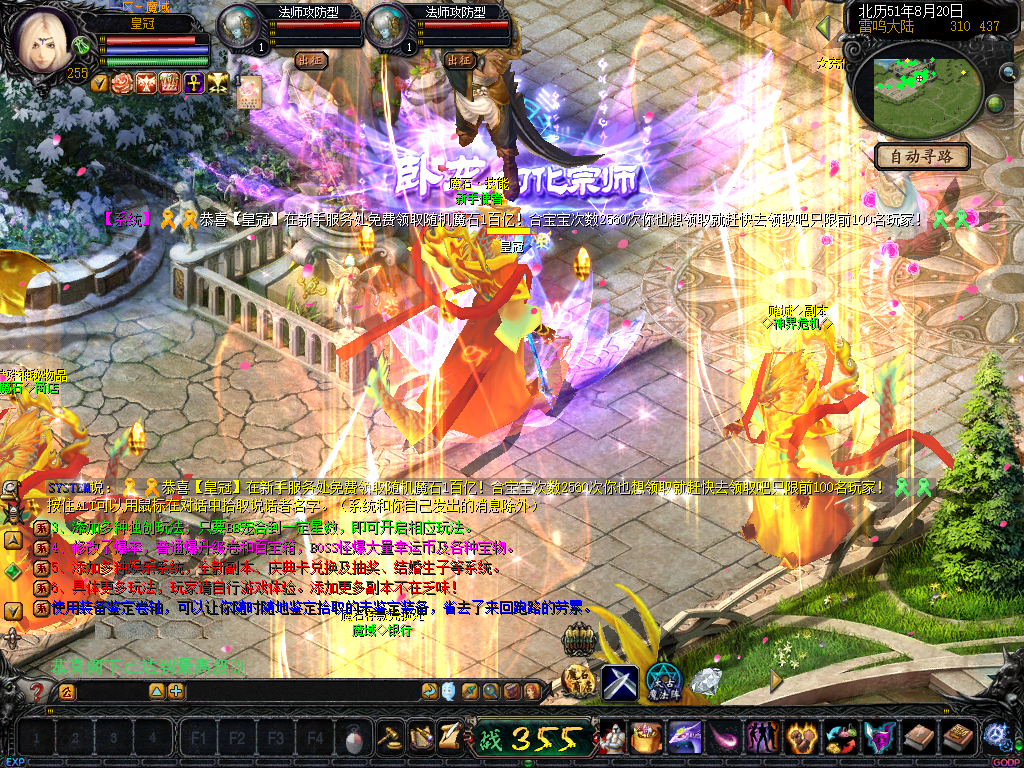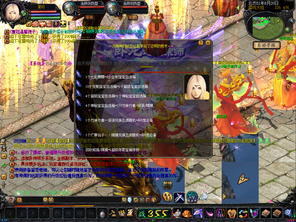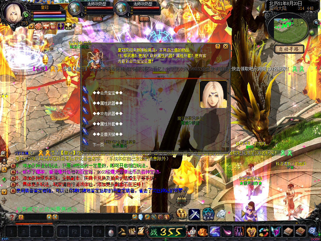 01、上线送VIP10人物255级和赠1000万MS,仓库对面会员NPC处领取全属性+255555装备一套.还可以一键学习本职业所有技能!雷鸣门口NPC领取!bs入包500万,蜘蛛王入包1000万
