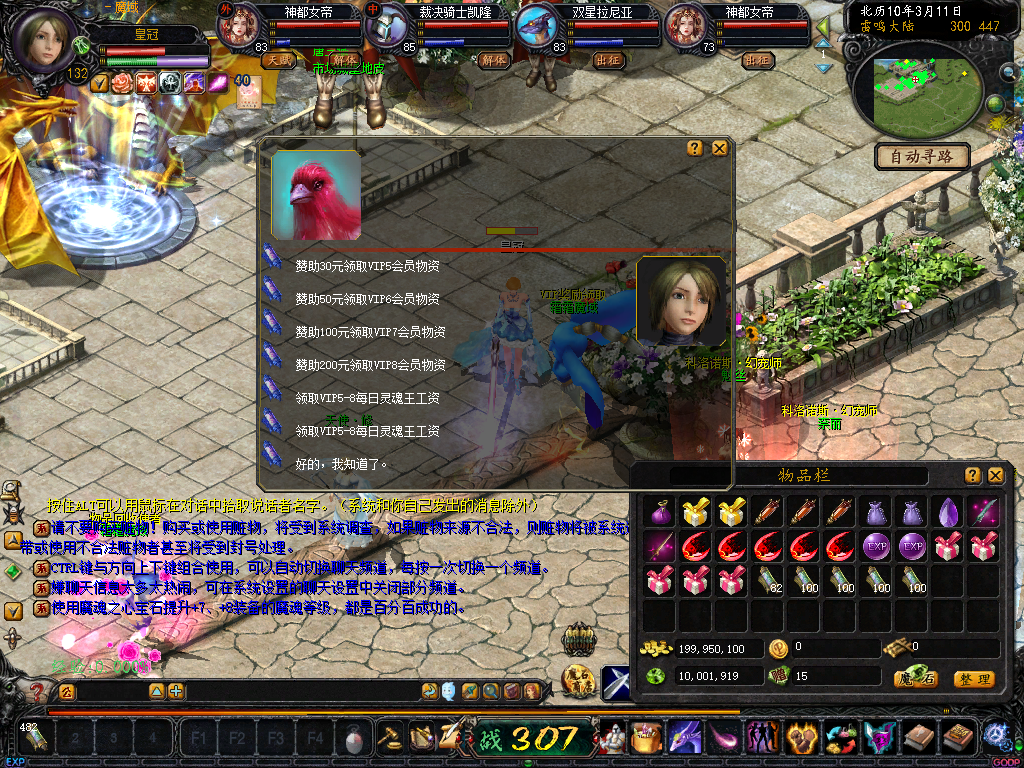 一次性充值100领取VIP7+7000MS+8个灵魂王+一把极品两洞经验+25%武器+会员宝宝一个+一个三宠水+三个起步蛋《2异界+1无翼者或者双星+凯龙+撼地者》二者选一+批零孵化1秒(幻想礼包全部功能)每天领取4灵魂王